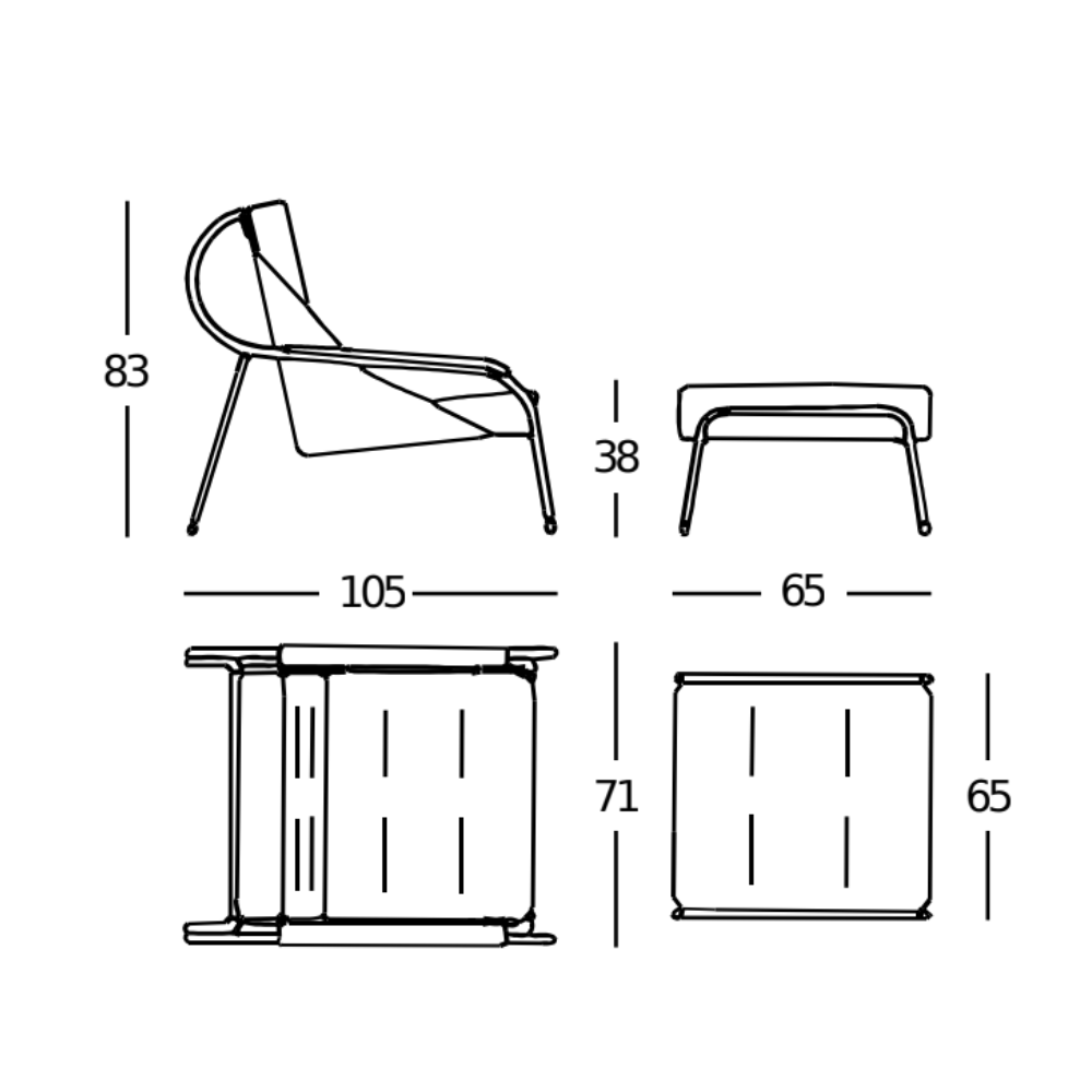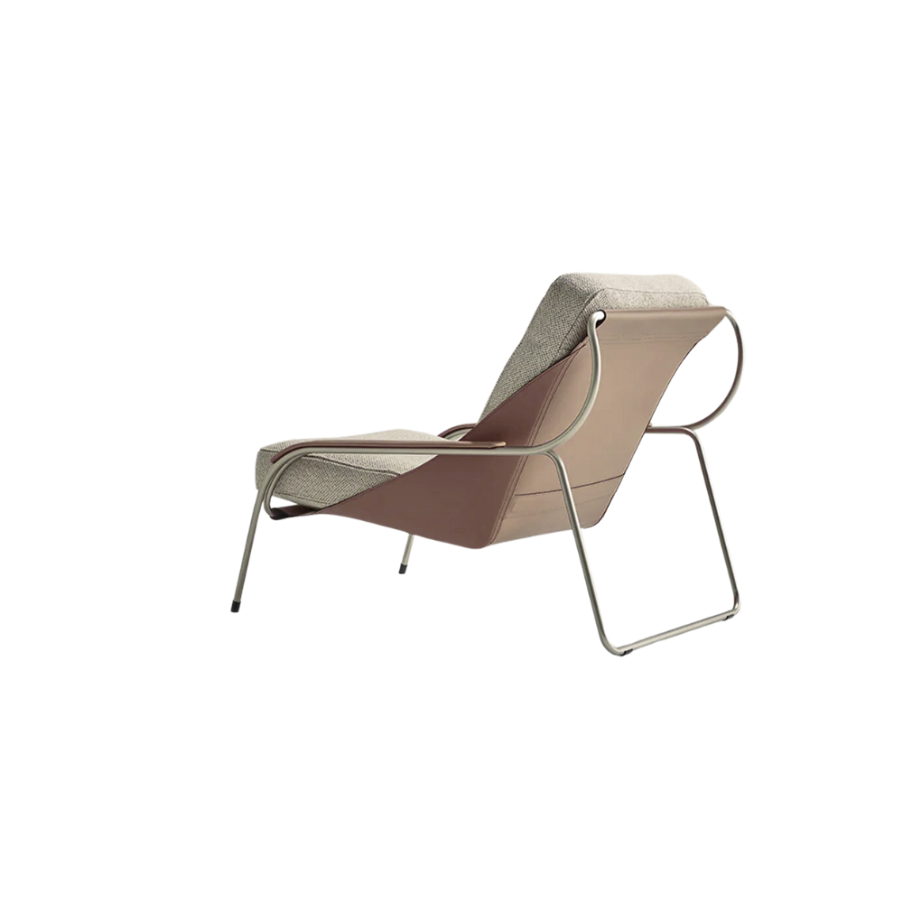 Armchair and pouf upholstered in TOCE light grey/brown (026504) pigmented fabric, CAT. 30 (50% cotton, 33% viscose, 17% linen), with mud-coloured leather inserts, CAT. 90 (841). Chromed steel frame. Designed by Marco Zanuso in 1947.