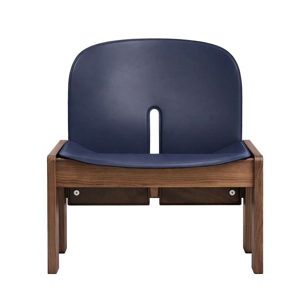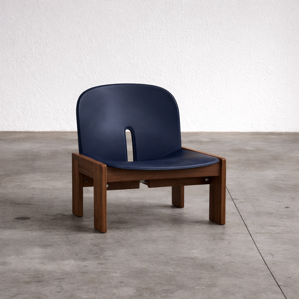 Diseñada en 1965 por Afra y Tobia Scarpa, la 925 es una lounge chair que equilibra elegancia estructural y confort anatómico. Su identidad se define por el contraste entre la solidez del marco de madera maciza y la ligereza visual del asiento y respaldo tapizados en cuero.