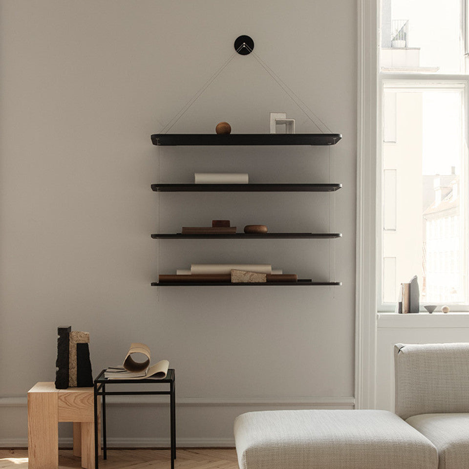 La composición reduce el sistema a lo esencial, permitiendo que libros y objetos se conviertan en protagonistas. El equilibrio entre tensión y apoyo genera una presencia gráfica precisa y ligera, que dialoga con la arquitectura sin imponerse.