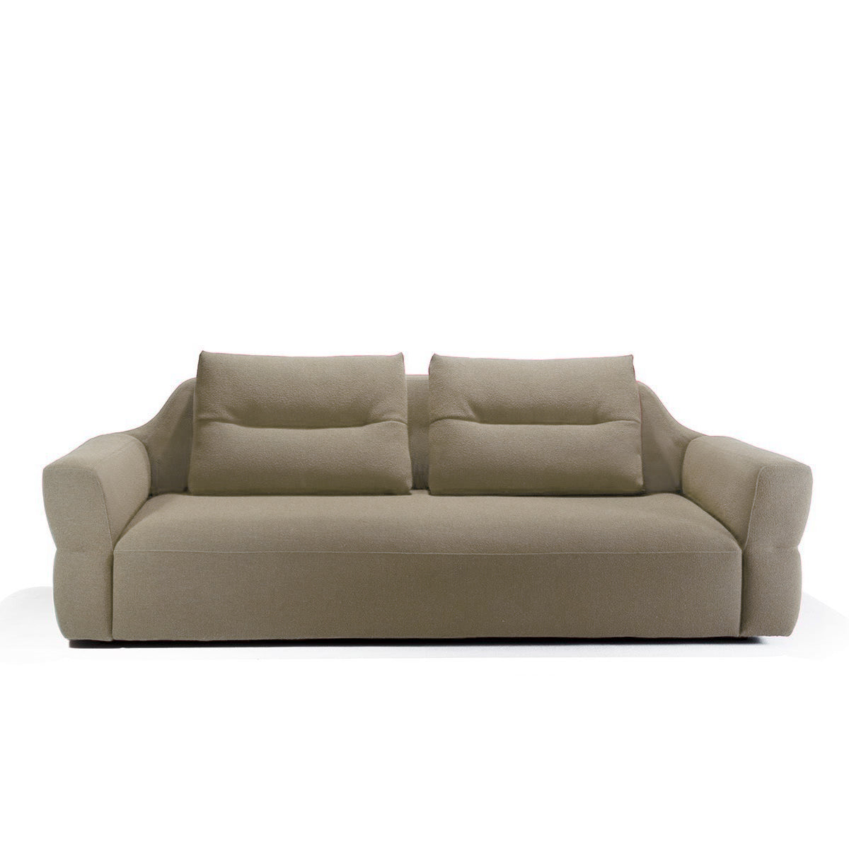 Sofá de dos cuerpos con estructura de madera contrachapada, apoyabrazos, cojines de respaldo y asiento en poliuretano, revestidos en tela Qatar (Cat. 40), color Tortora (040640).