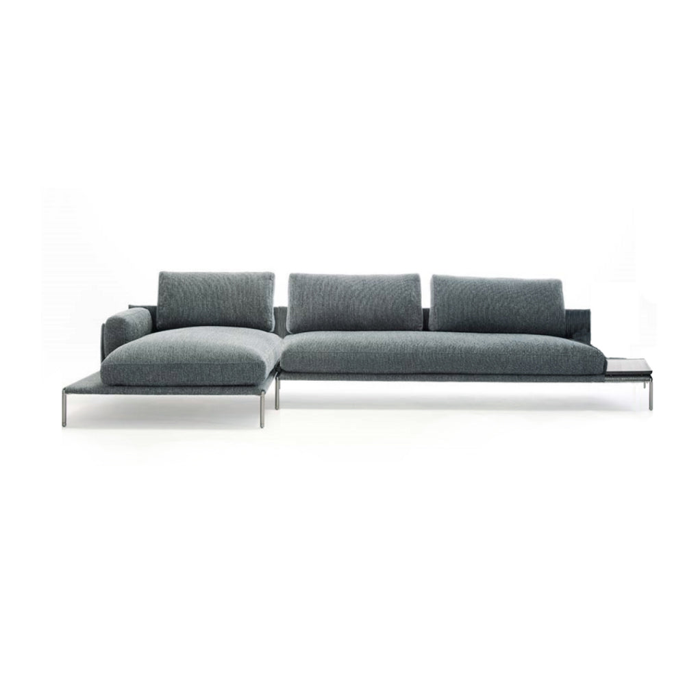 Modular sofa consisting of a two-seater module with a solid ash tray painted matte black and a chaise longue on the left side . Steel legs, varnished graphite finish. Steel frame. Elastic strap suspension. One-piece seat cushion. Back cushion made of 100% new goose down. Removable outer cover in sage green Talento cat30 fabric (027644), 72% linen, 14% cotton.