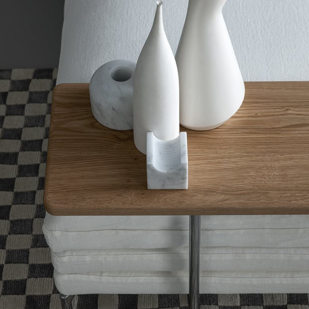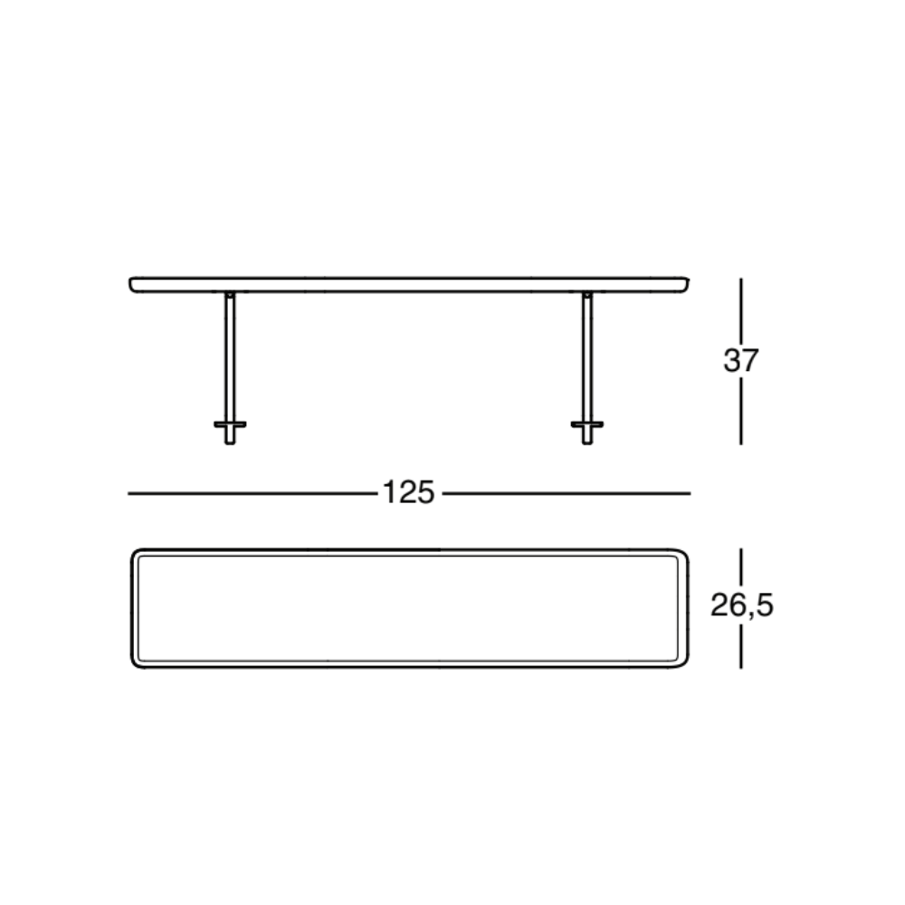 Natural oak shelf, 125 cm long, with a natural satin nickel finish support.