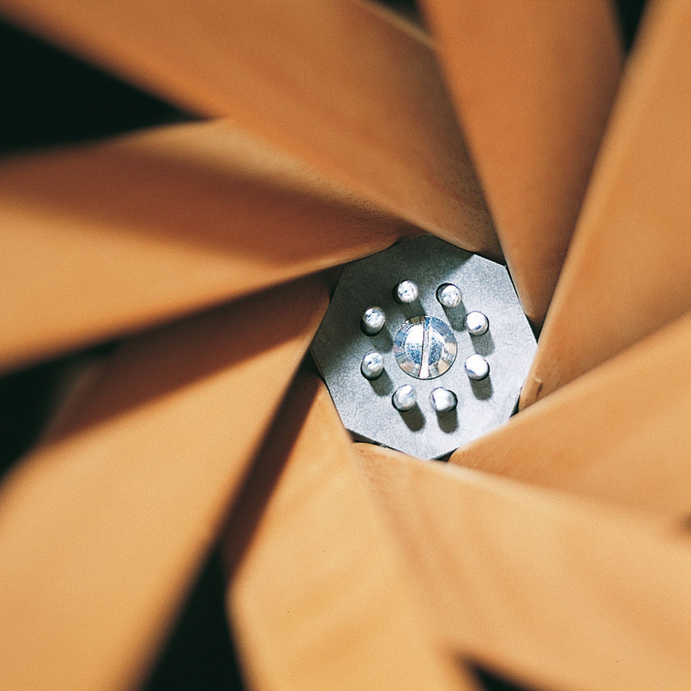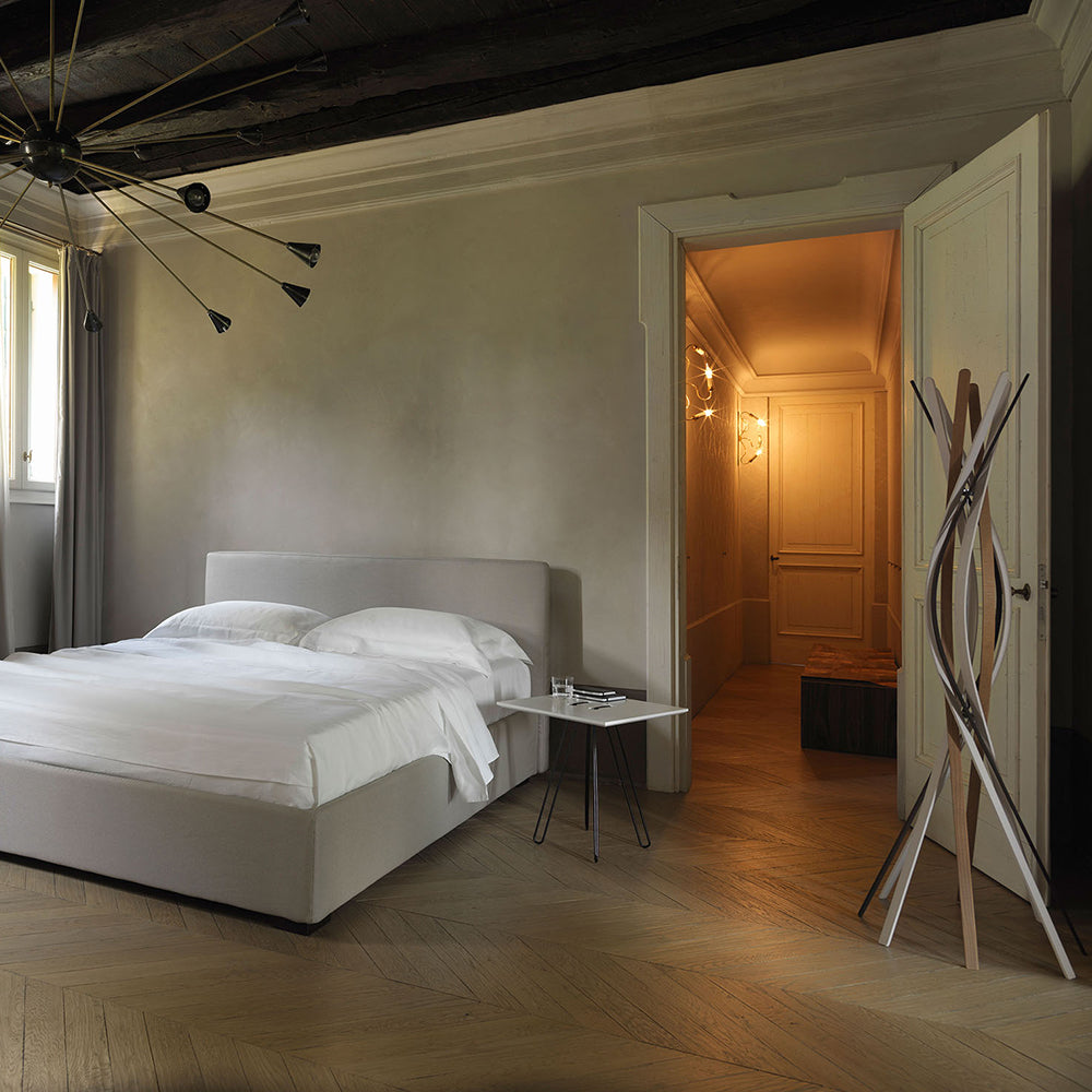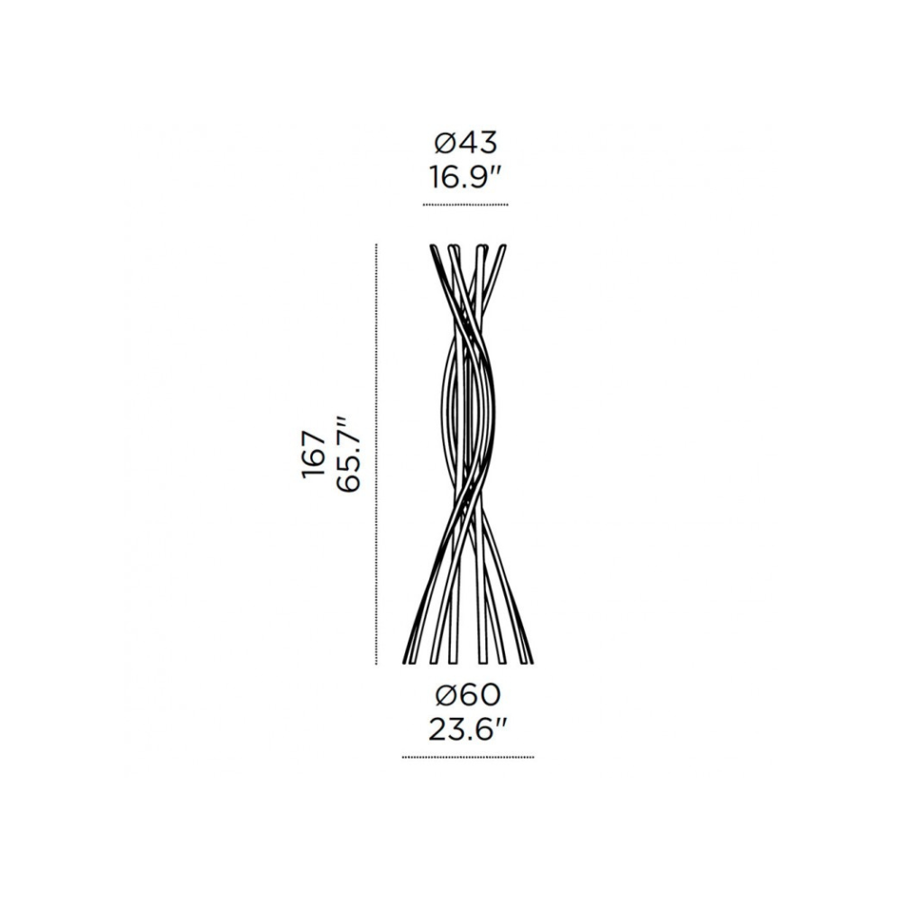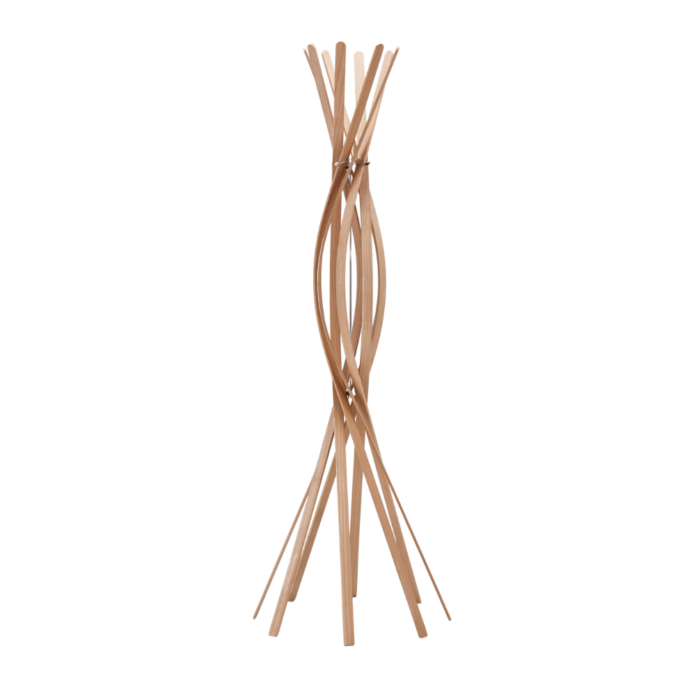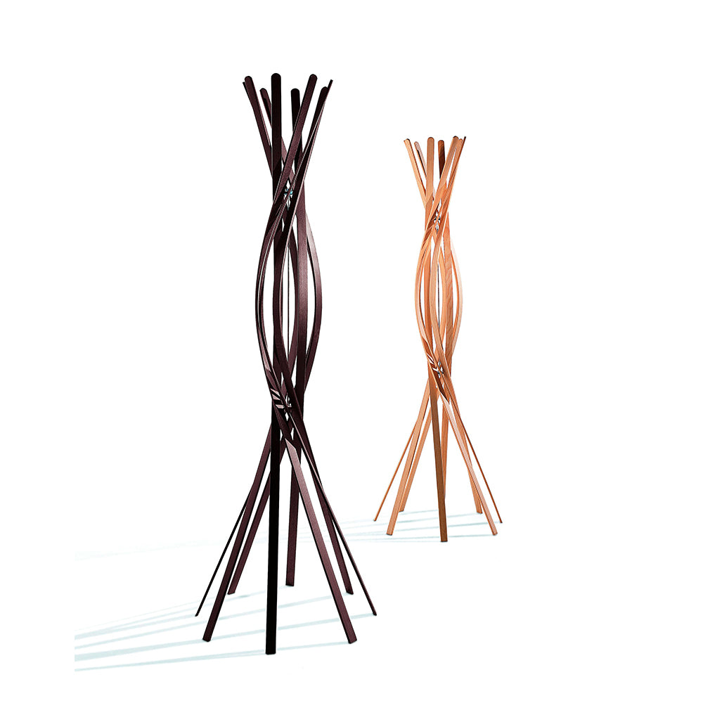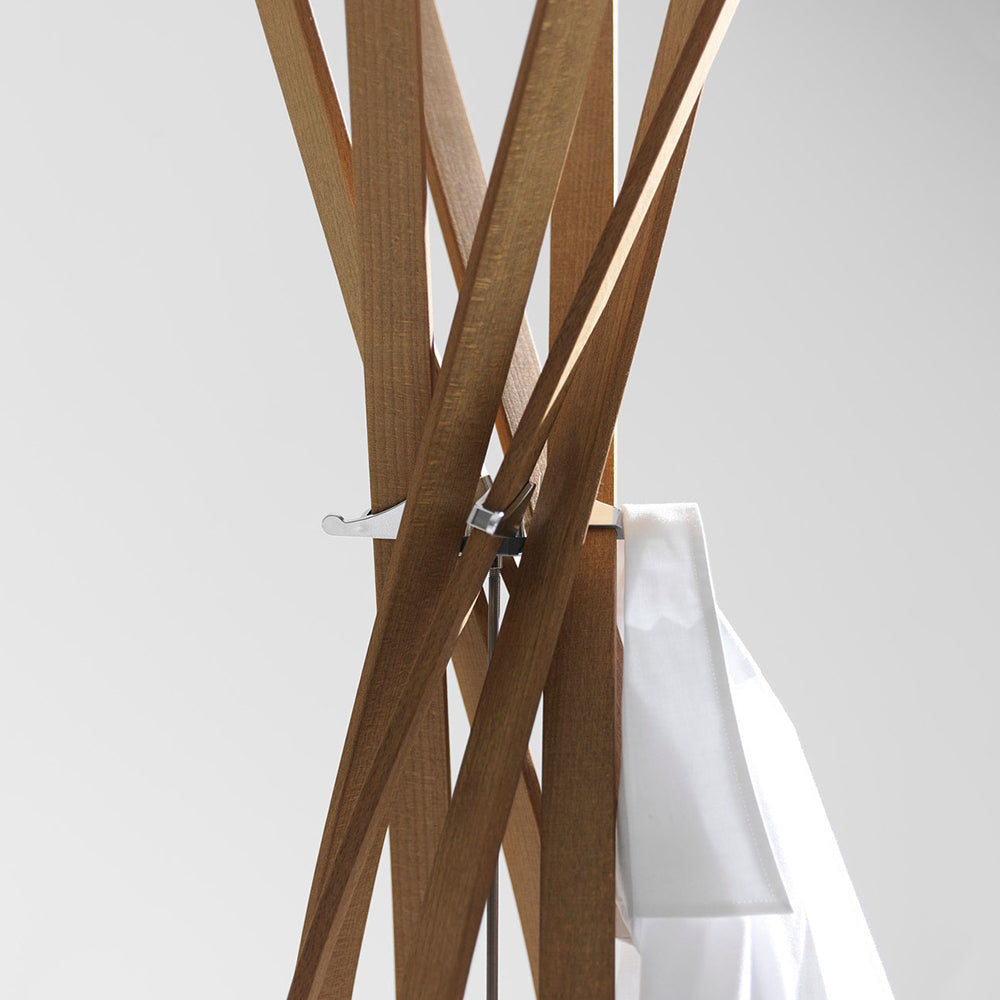 Coat rack composed of solid bent beech wood elements, water-based and stained in a natural color. The two steel L-shaped hooks, inserted into the wooden elements, fit into the holes in two fiberglass octagons, connected by a steel tie rod. Four chrome-plated ABS hangers complete the rack and can be freely positioned on the wooden elements.