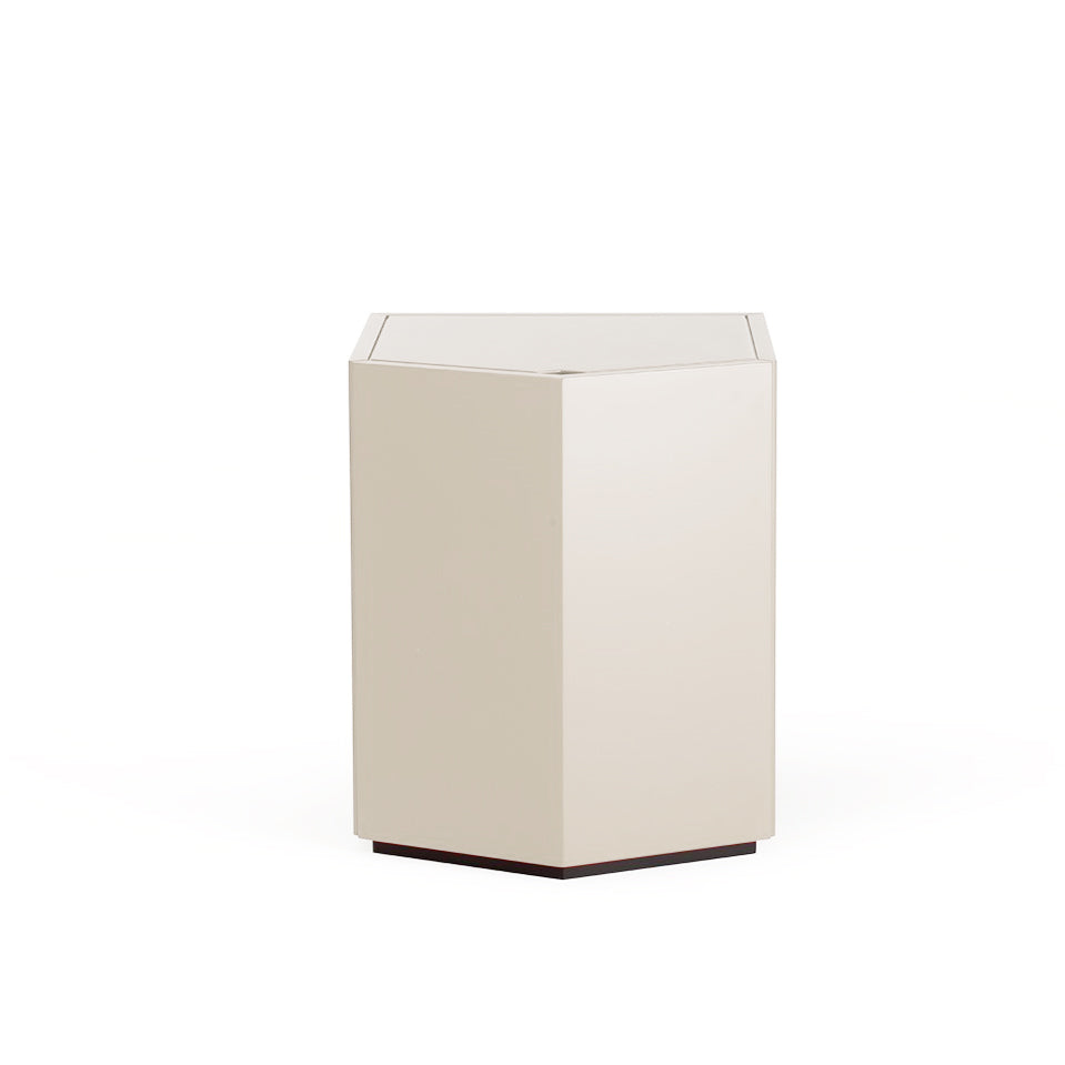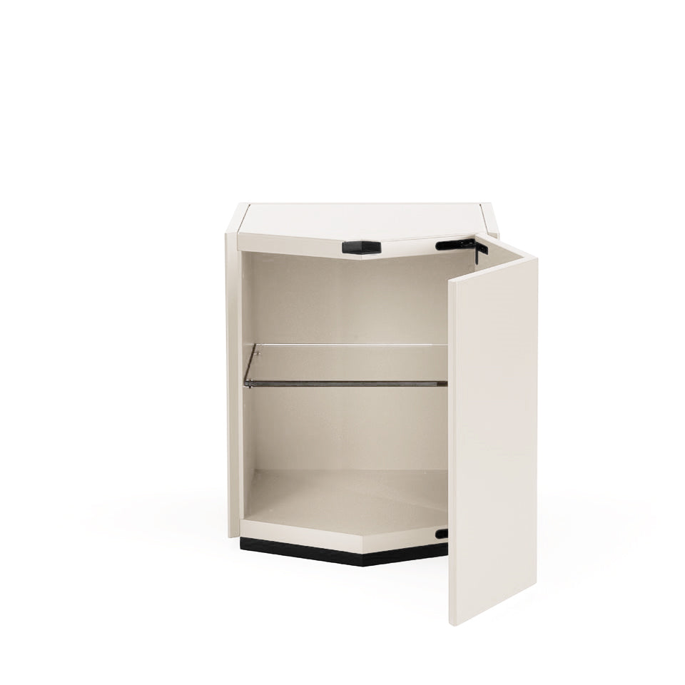 Left-hand nightstand with a matte talc-lacquered MDF frame and adjustable interior shelf made of 10 mm thick tempered glass. Designed by Muller Van Severen.