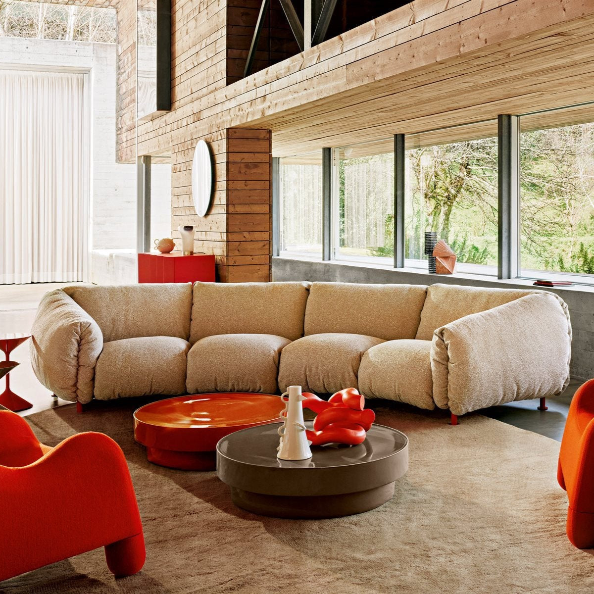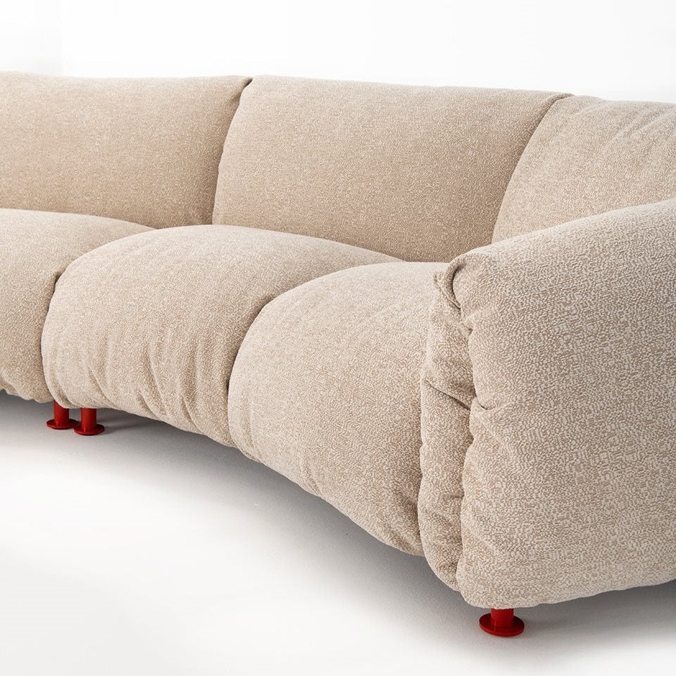 Configuración: sofá de dos cuerpos con terminal izquierdo y derecho + puf. Estructura en acero pintado color amaranto; cojines de asiento, respaldo y apoyabrazos en poliuretano; tapizado en tela Viero (Cat. 20) color Sabbia (024607).