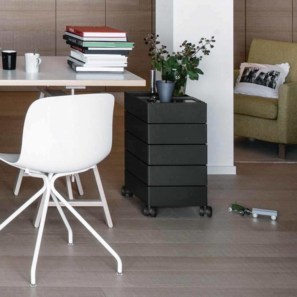 Cajonera con ruedas y 5 cajones en plástico ABS color negro.