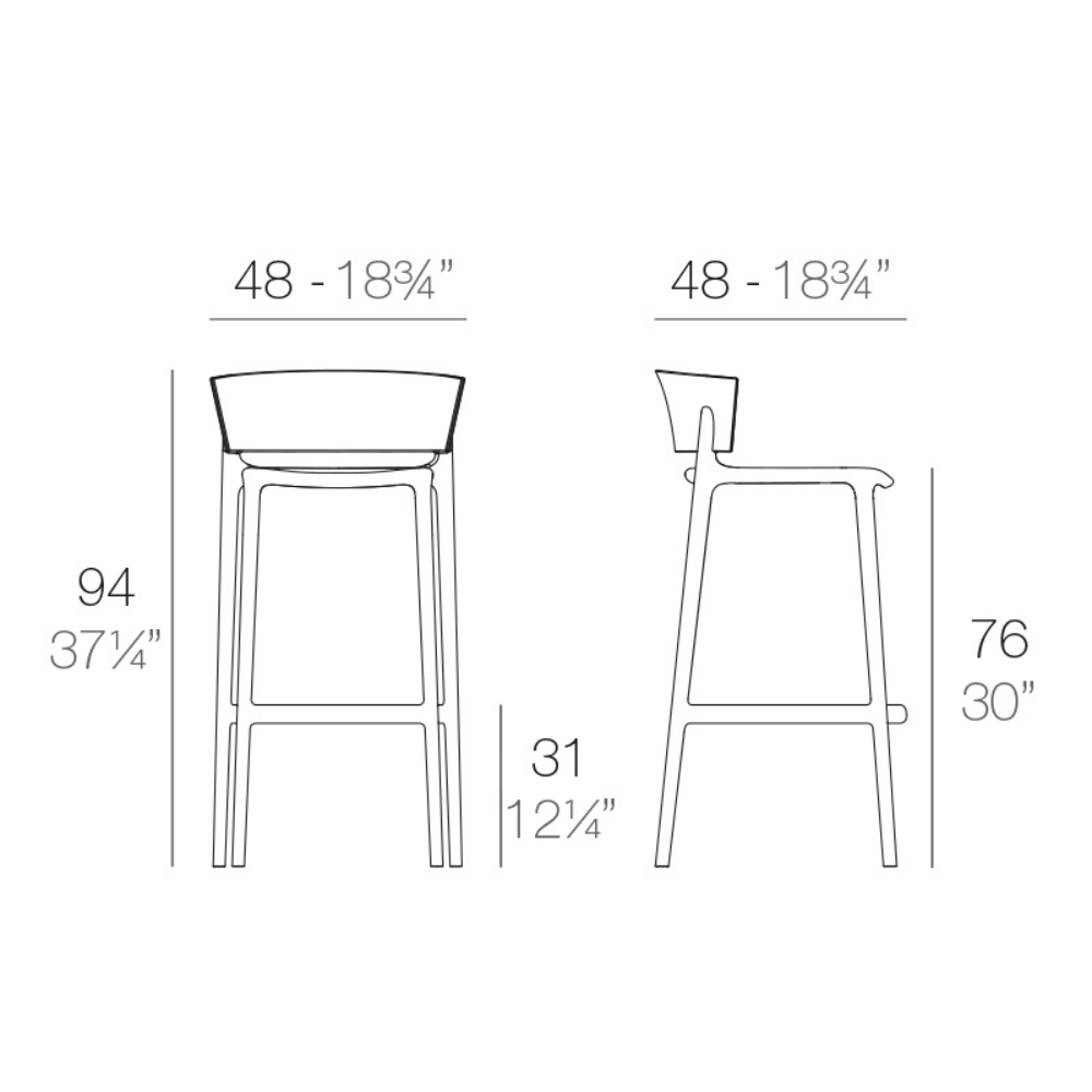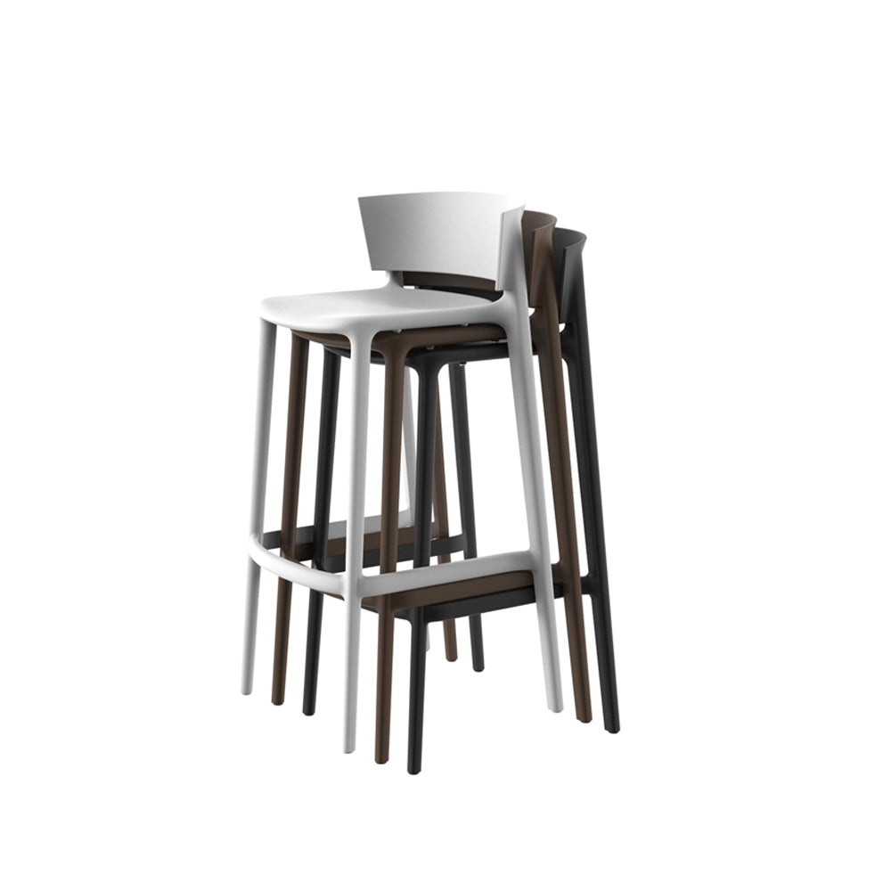 Taburete en color negro fabricado en polipropileno por inyección con gas air moulding y reforzado con fibra de vidrio. Apilable. Apto para uso interior y exterior.