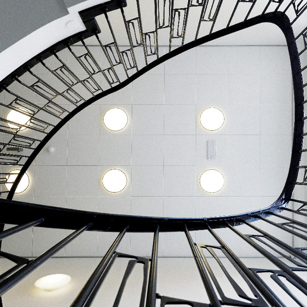 Equipo sobrepuesto (mural o cielo) circular con difusor en vidrio opal. 9W LED 2700K 468lm. Diámetro 220 mm.