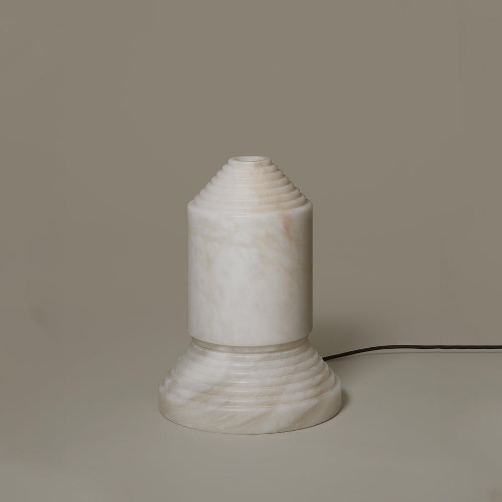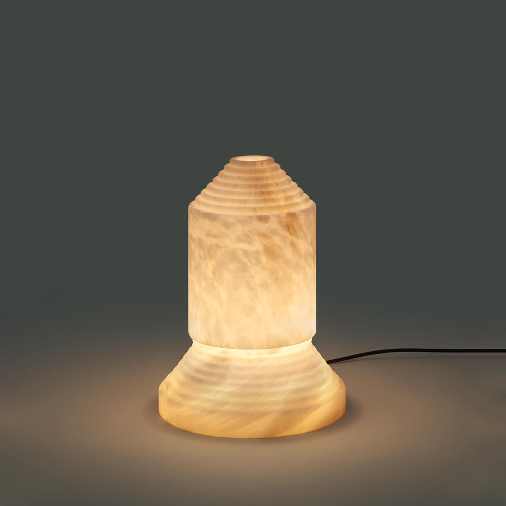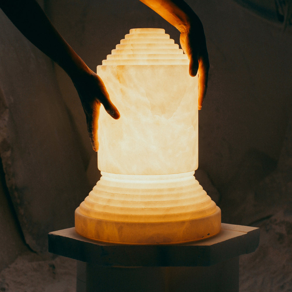 Babel, cuyo nombre alude a la inacabada torre bíblica, se presenta como una escultura firme que es también una lámpara para la intimidad nocturna. El alabastro, macizo en la base y vaciado en la pantalla, sin que dos unidades puedan ser iguales, hace de ella una pieza de arte que nació como provocación contra al gusto dominante.