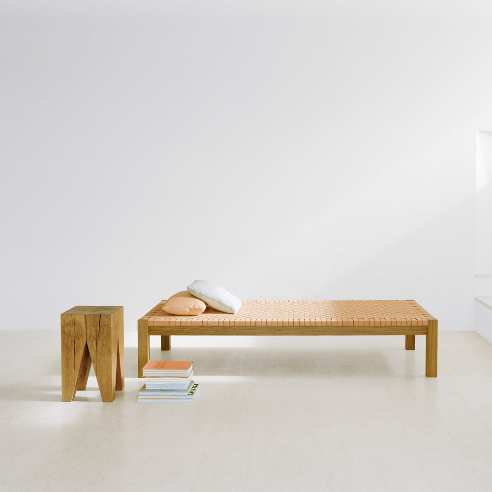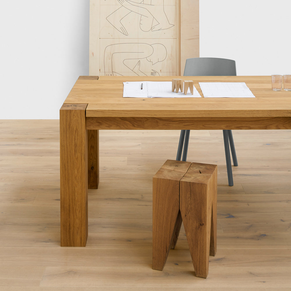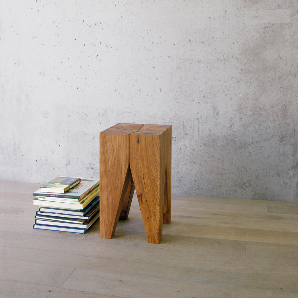 Taburete en madera de roble tratado al aceite. Durante el curado de la madera maciza, las patas forman sus grietas características, que hacen que cada taburete sea único. El corte oblicuo de la hendidura crea el borde en forma de cuña.
