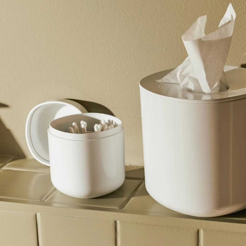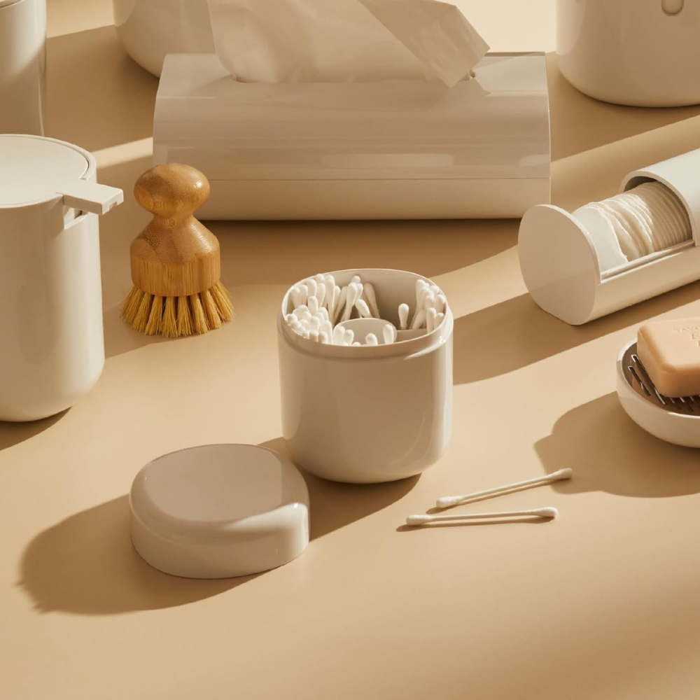 Recipiente para bastoncillos de algodón en PMMA blanco.