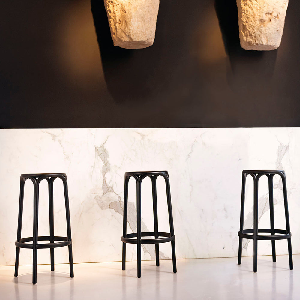 Taburete en color negro fabricado en polipropileno por inyección y reforzado con fibra de vidrio. Apilable. Apto para uso interior y exterior.