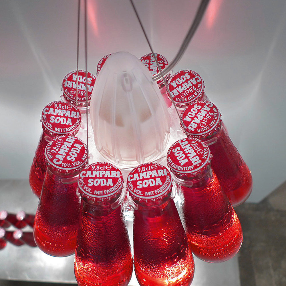 Material: 10 botellas de Campari Soda, plástico y metal.