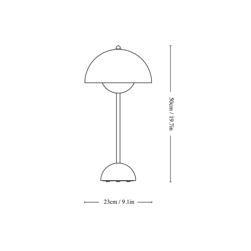 Lámpara de sobremesa con dos esferas semicirculares de distintos tamaños enfrentadas, en metal color mostaza. Diseñada por Verner Panton (1968). Diámetro 23cm.