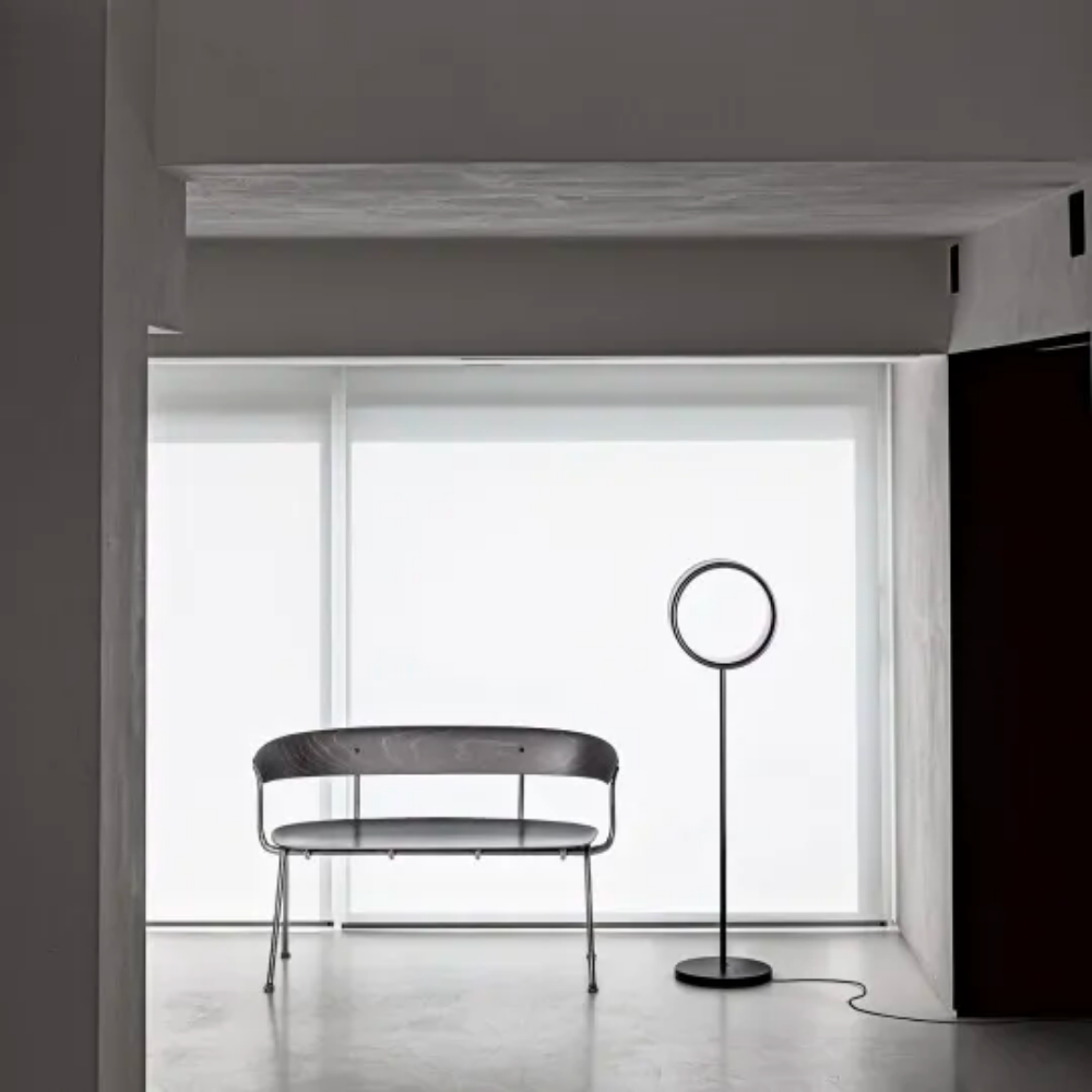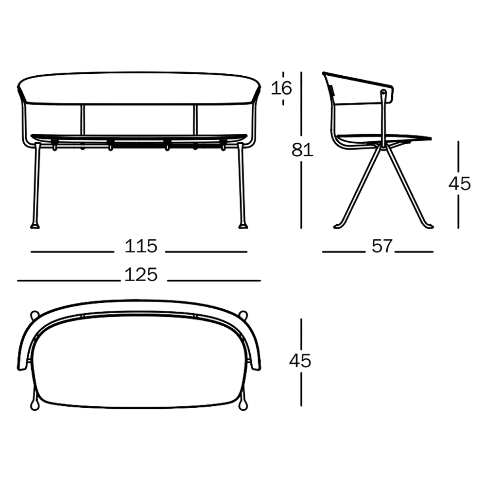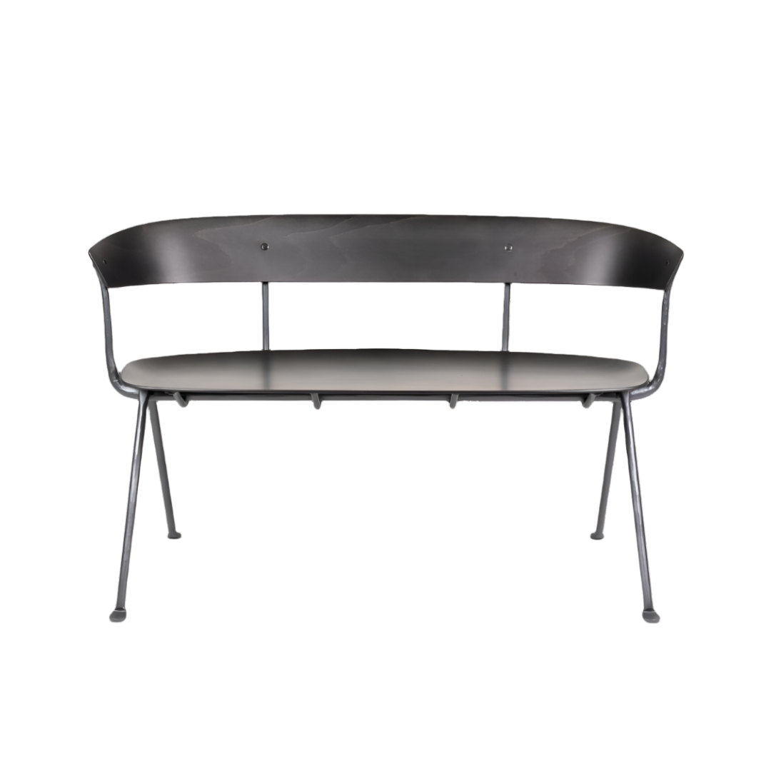 Sofá de estructura de hierro forjado color antracita y asiento de madera contrachapada color negro. Medidas 125x57x81 cm.