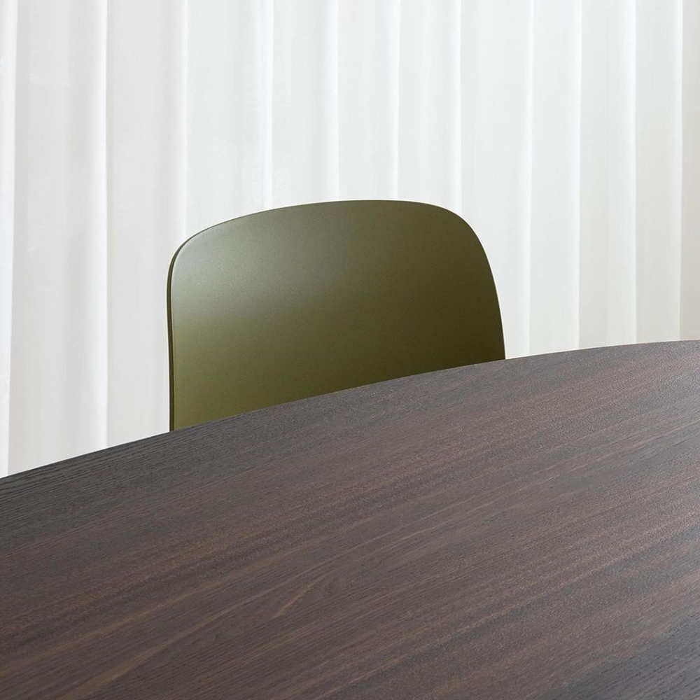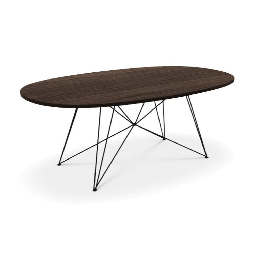 Mesa oval con estructura en barra de acero barnizado epoxi negro. Cubierta acabado roble termotratado.