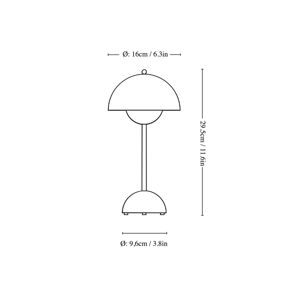 La lámpara VP9 conserva el diseño icónico de la Flowerpot en un formato más compacto y versátil. Su estructura ligera y el sistema inalámbrico permiten trasladarla fácilmente de una mesa a otra, ofreciendo libertad para ambientar distintos espacios con un mismo objeto.