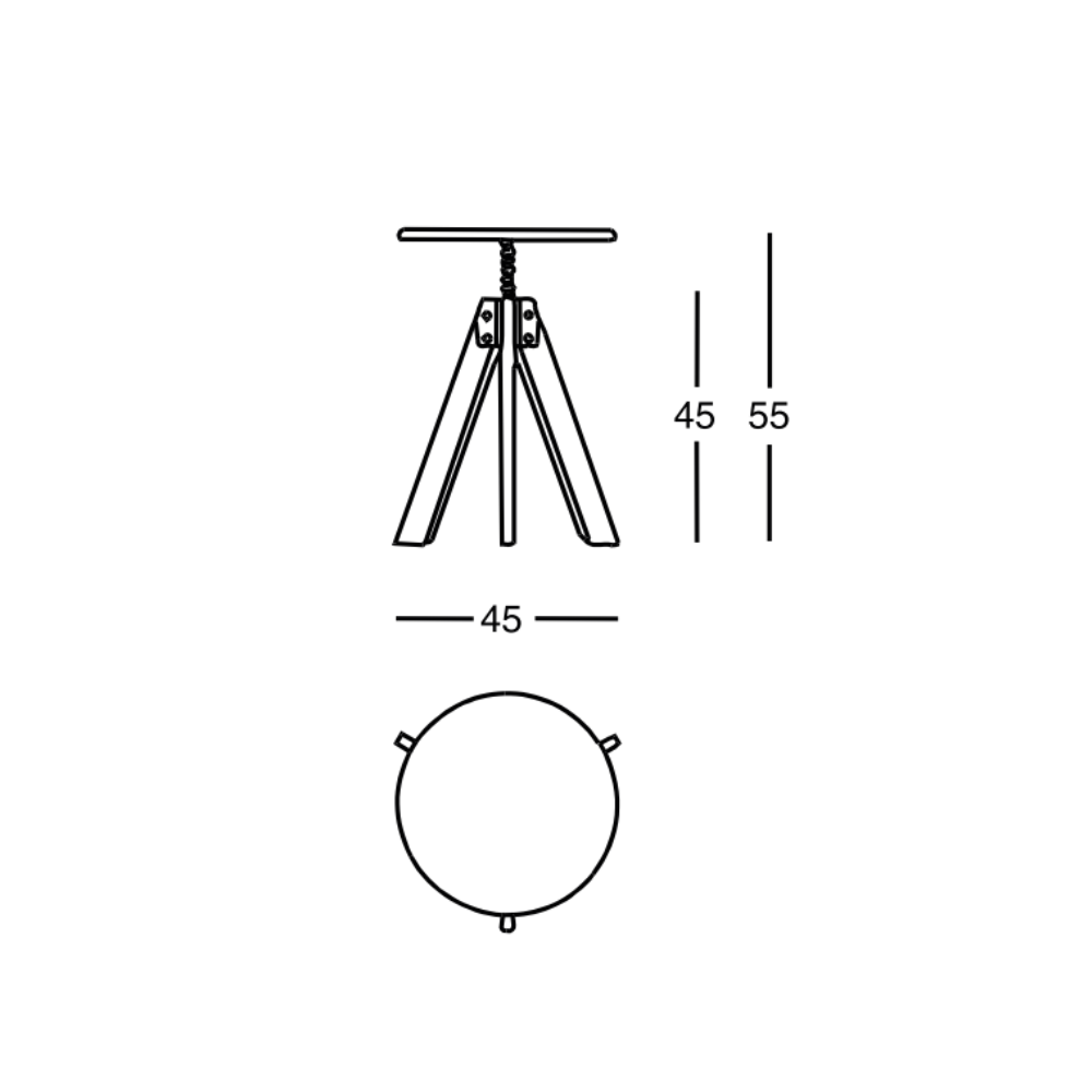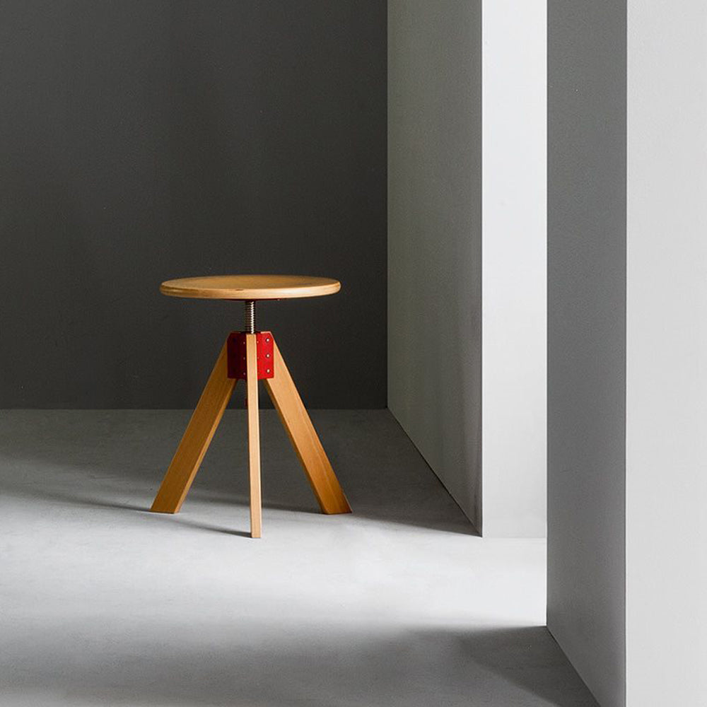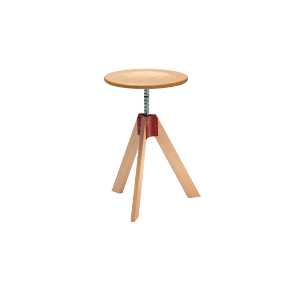 Su estructura está formada por tres patas de haya barnizada al natural, unidas por un soporte pintado de rojo y resaltado intencionalmente, al igual que la varilla roscada, claramente visible, que sostiene el asiento redondo y permite ajustarlo fácilmente en altura.