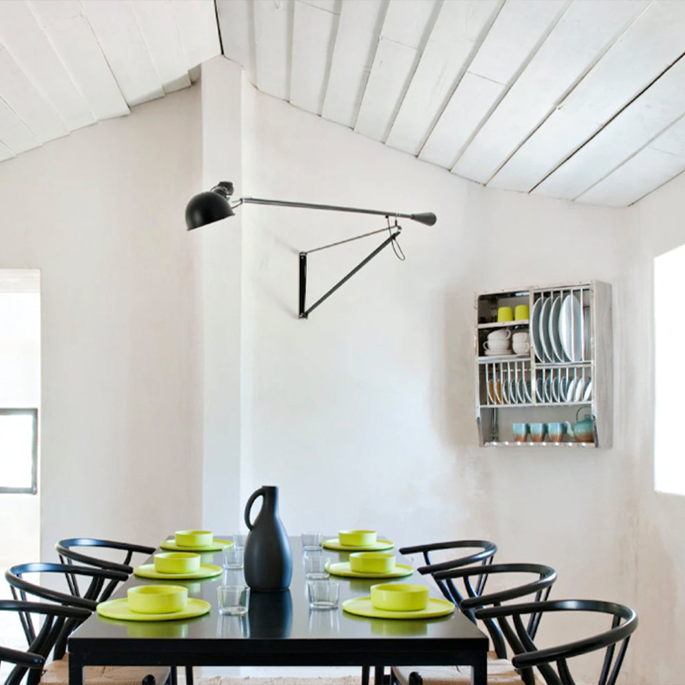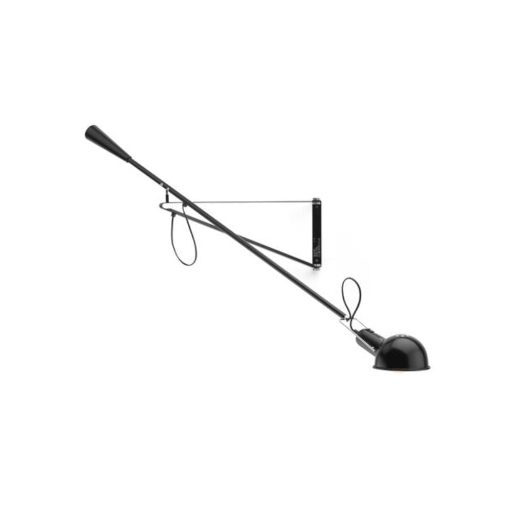 Aplique de pared de luz directa. Brazo orientable y reflector de acero pintado. Soporte reflector de latón cromado. Contrapeso cónico de hierro fundido. Aplique de pared de acero pintado; con interruptor integrado on/off. Color Negro. Diseñado por Paolo Rizzatto, 1973.