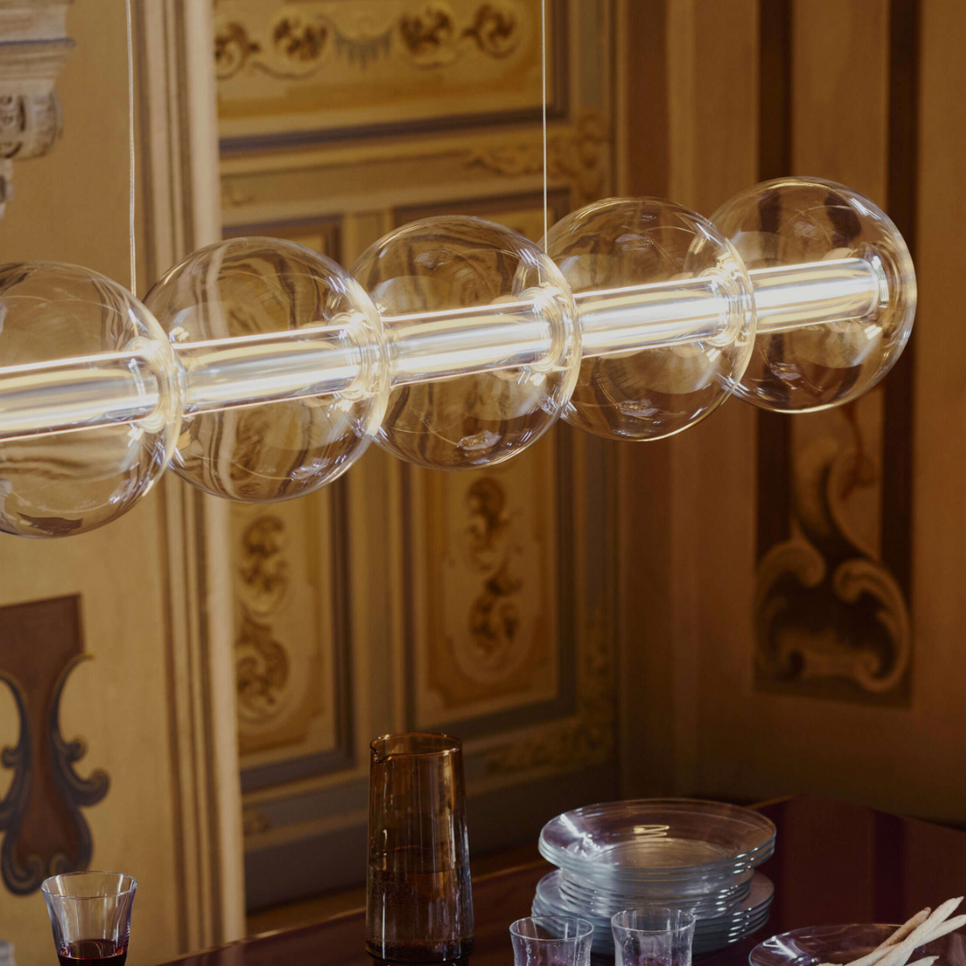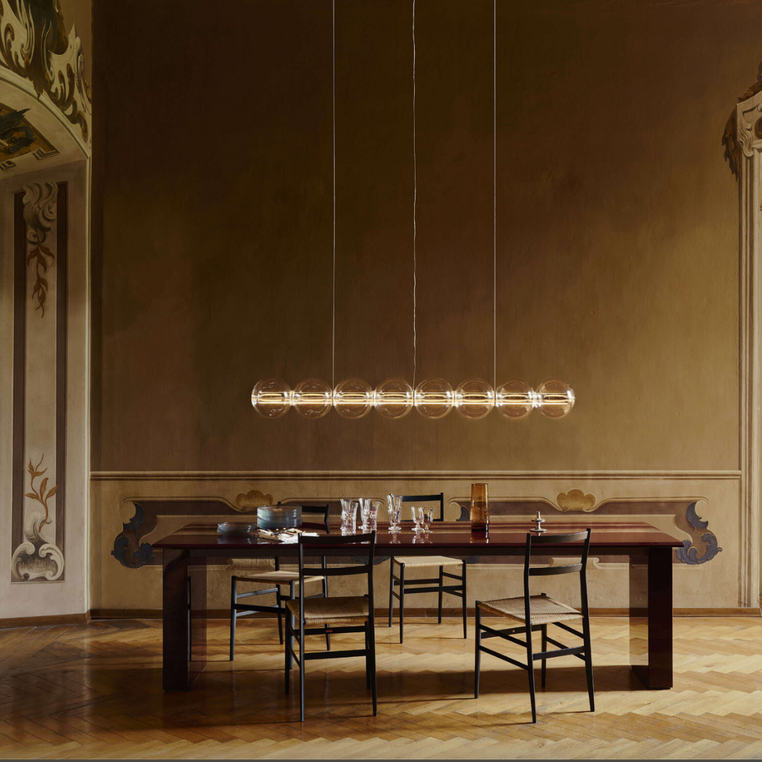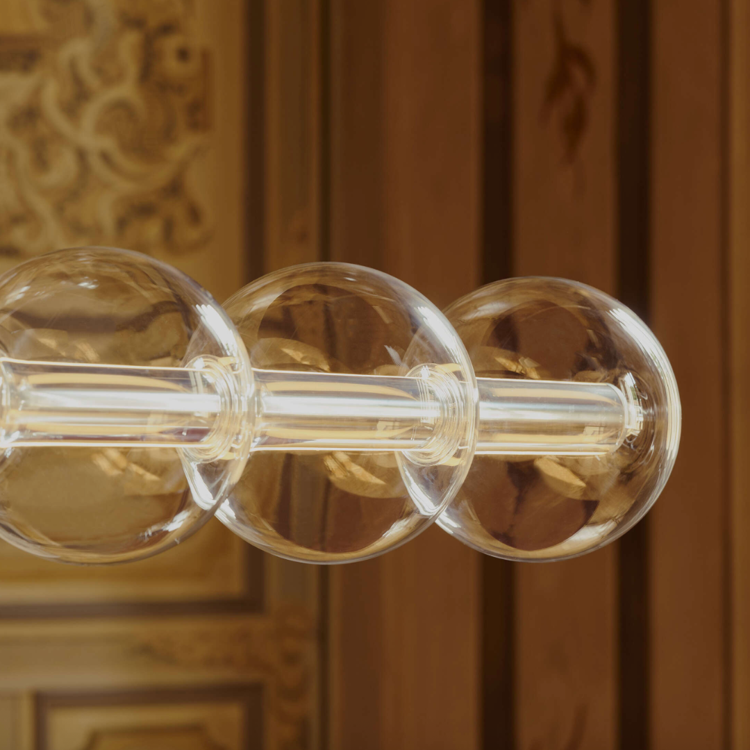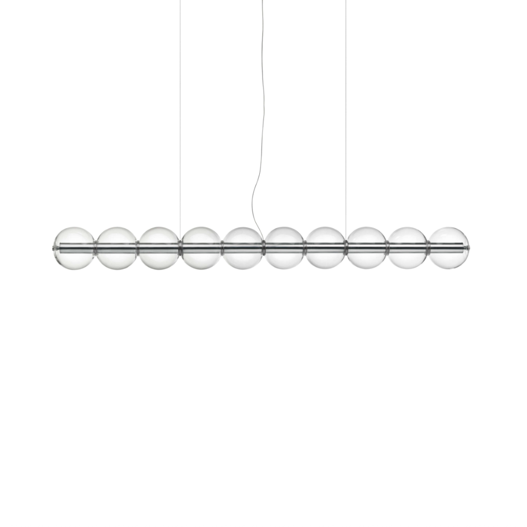 Su cuerpo de aluminio extruido pulido integra dos tiras de LED que emiten luz tanto ascendente como descendente, generando una iluminación difusa y equilibrada. La estructura se recubre con una secuencia de esferas de vidrio transparente soplado a mano, separadas por espaciadores tradicionales, que filtran la luz y aportan ritmo, transparencia y profundidad visual.