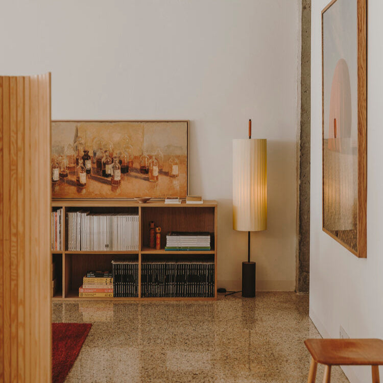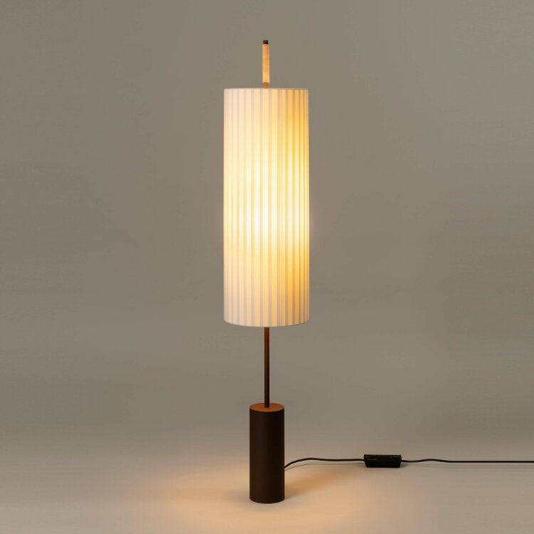 Lampara de pie Dórica. El equilibrio de los materiales que componen esta lámpara, su pantalla de algodón, la estructura metálica y la empuñadura cosida en piel, hacen de ella una vindicación de la artesanía industrial. Su fuerte presencia convierte a Dórica en una imponente estructura lumínica que evoca a la columna clásica.