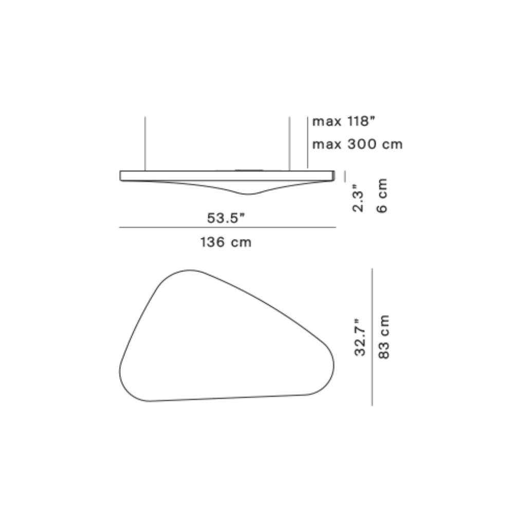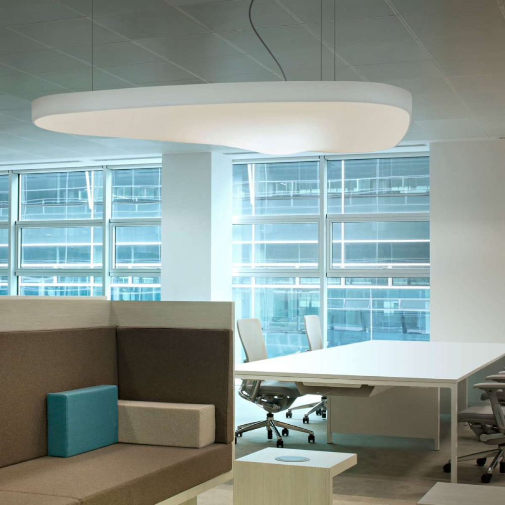 Lámpara de suspensión con forma orgánica, panel fono absorbente que permite mejorar el confort acústico en el interior del espacio. Cuerpo + óptica, con cinta LED perimetral de 17W 3000K 945lm, LED central de 42W 3400lm 3000K.