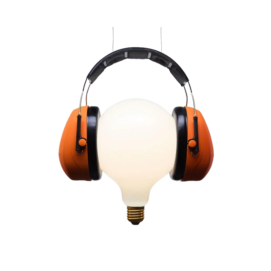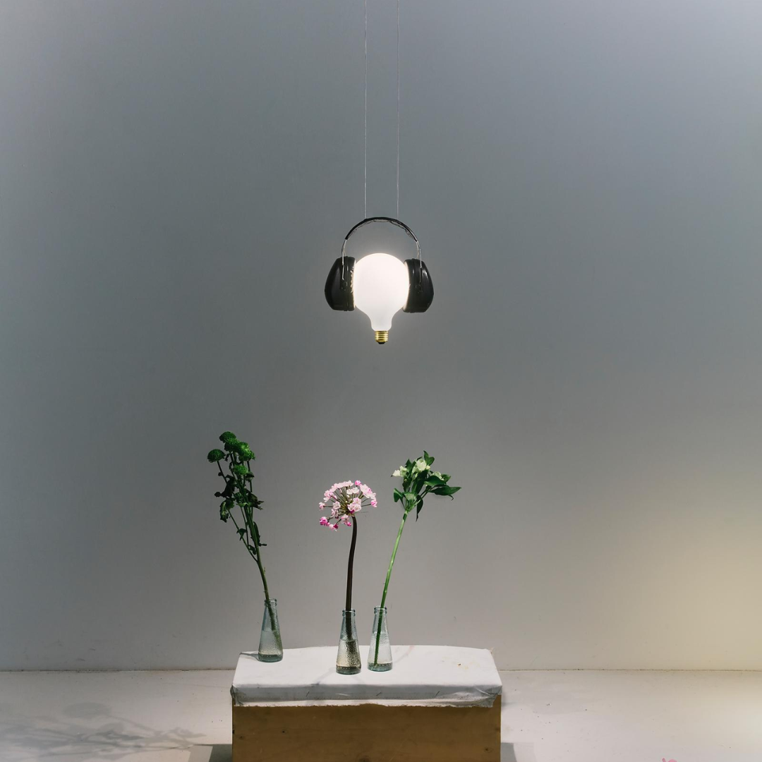 La sorpresa se revela al encenderla. La luz no proviene de la ampolleta, sino que se oculta en el interior de los audífonos, desde donde se difunde suavemente a través del vidrio. Dos focos integrados proyectan además acentos de luz dirigidos hacia las superficies inferiores, reforzando su carácter escénico.