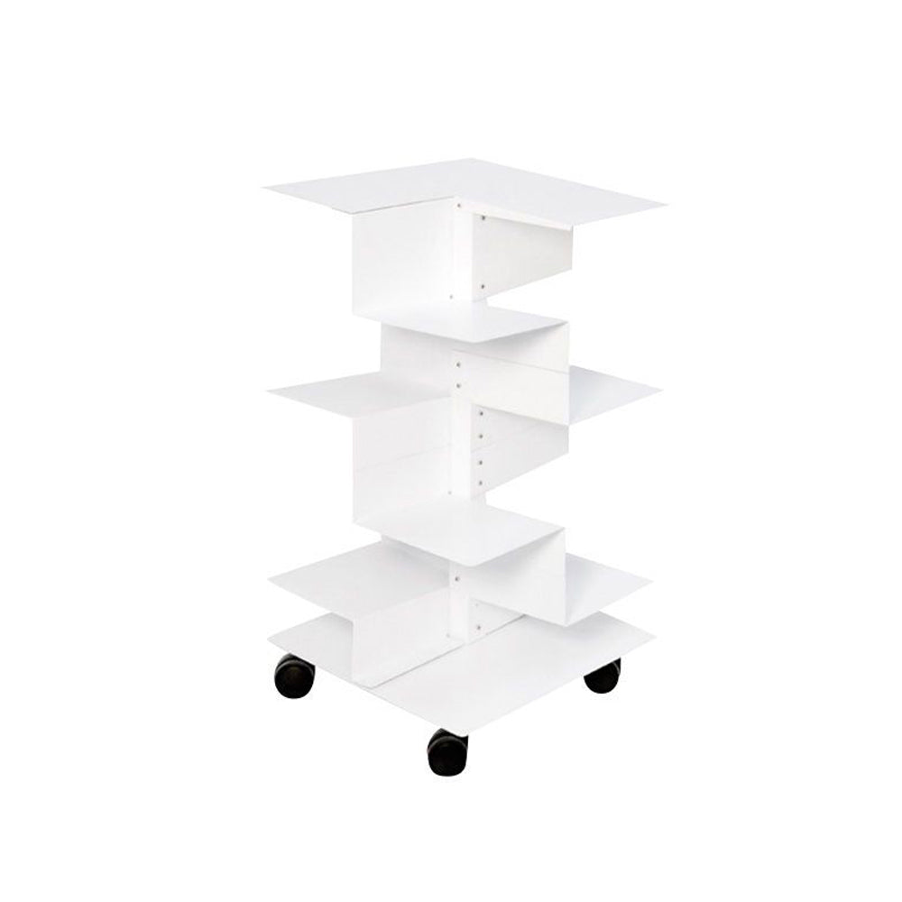 Librería con estructura y repisas en metal pintado color blanco sobre ruedas.