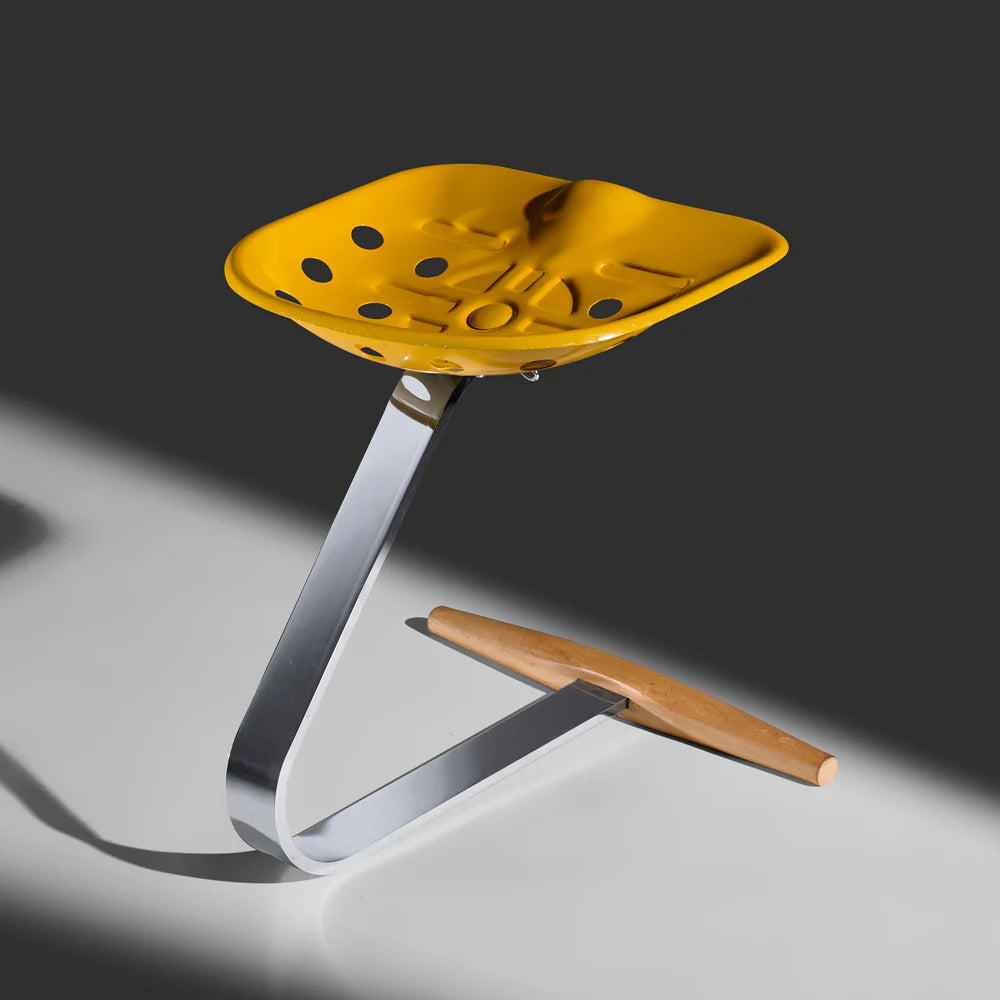 Su estructura —un asiento de tractor apoyado sobre una barra de acero cromado y una base de madera de haya— ensambla materiales y referencias provenientes del mundo agrícola, industrial y náutico.