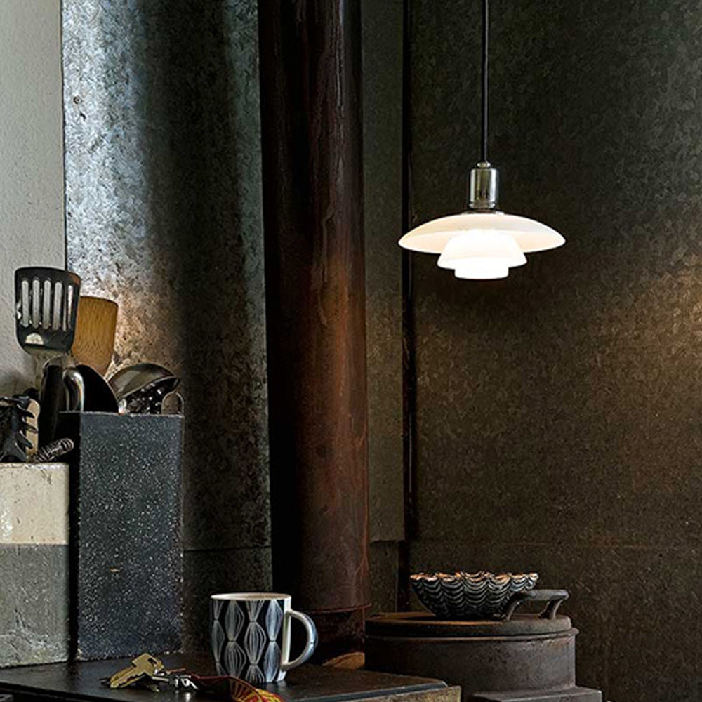 Lámpara de suspensión con 3 difusores de cristal soplado color blanco opalino y cuerpo cromado. 1 x40W E14.
