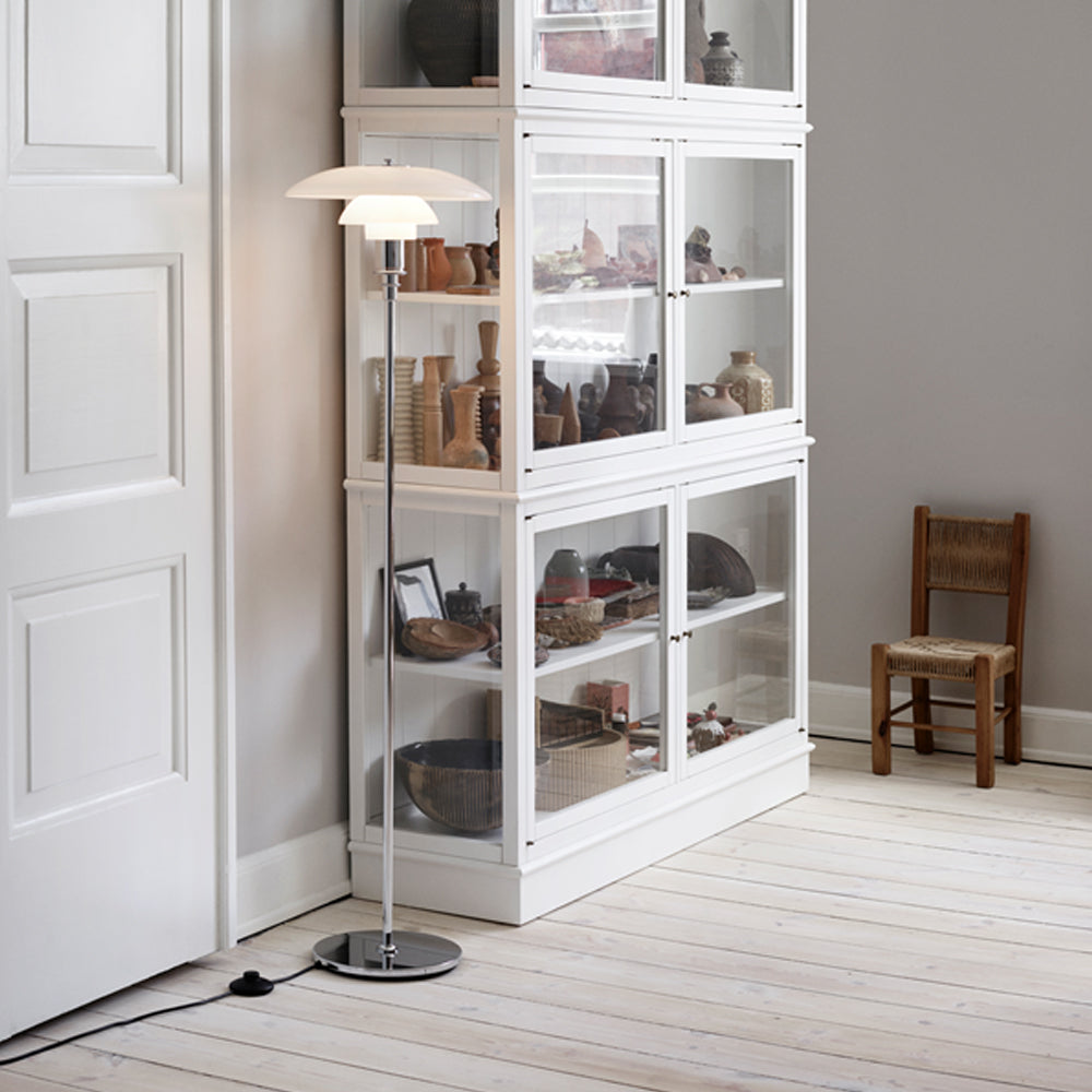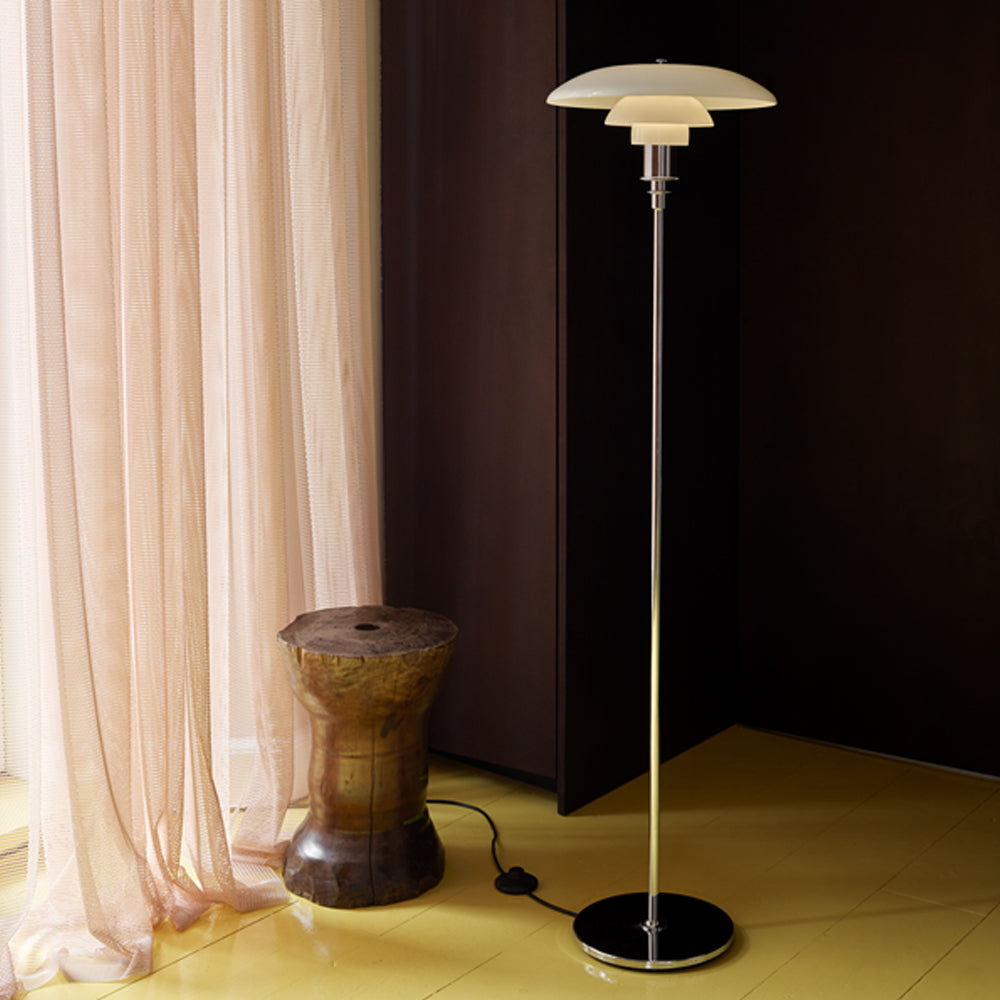 Lámpara de pie con 3 difusores de cristal soplado blanco opalino y cuerpo platinado. 1 x 100W E27. Diam 330 cm
