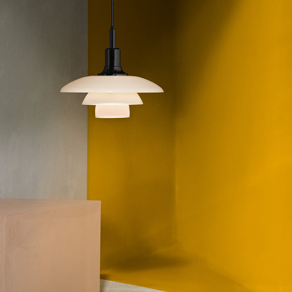 Lámpara de suspensión con 3 difusores de cristal soplado blanco opalino y cuerpo cromado. 1 x100W E27. Diam 330 mm.