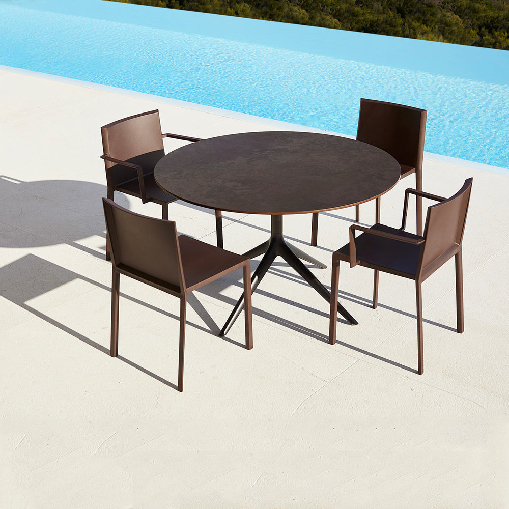 Silla con brazos fabricada en polipropileno por inyección y reforzada con fibra de vidrio. Apilable. Apto para uso interior y exterior.