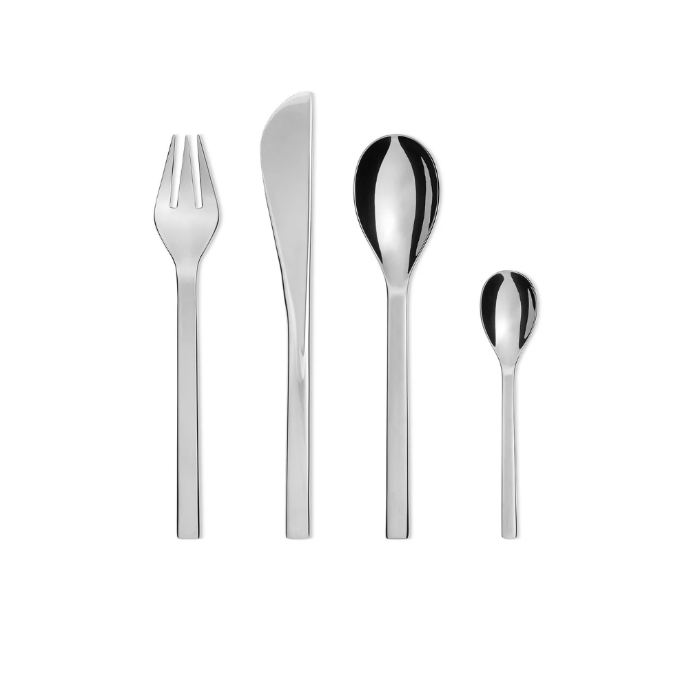 Servicio de cubiertos compuesto de seis cucharas, seis tenedores, seis cuchillos y seis cucharas para café en acero inoxidable 18/10. Apto para lavavajillas.