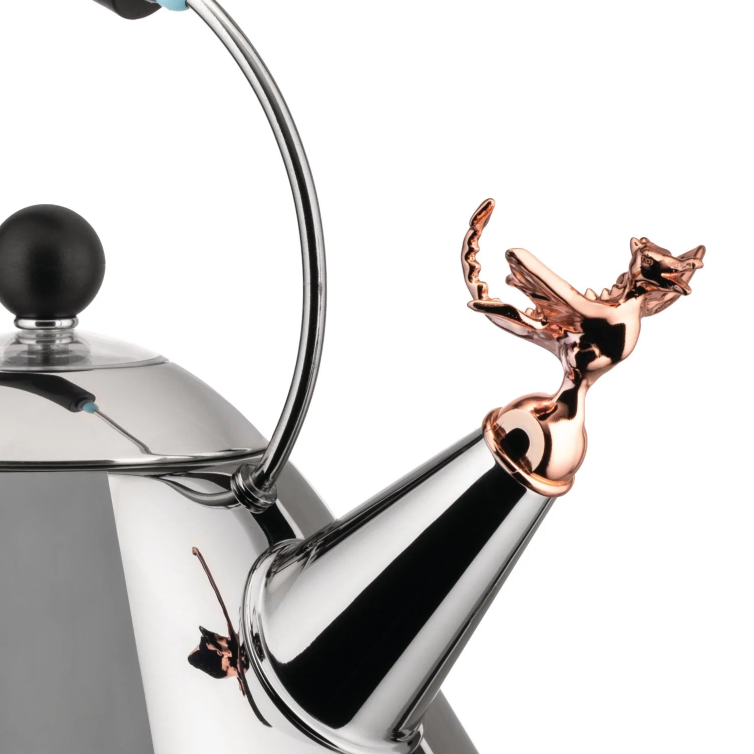 Para celebrar los treinta años de la tetera 9093, Graves ha rediseñado el silbato transformando el pajarito en una fascinante criatura mitológica y futurista: un dragón, un dinosaurio volador. Símbolo de fuerza y suerte en la cultura china, el dragón ha sido elegido como emblema de buen augurio para quien lo ponga en su cocina.