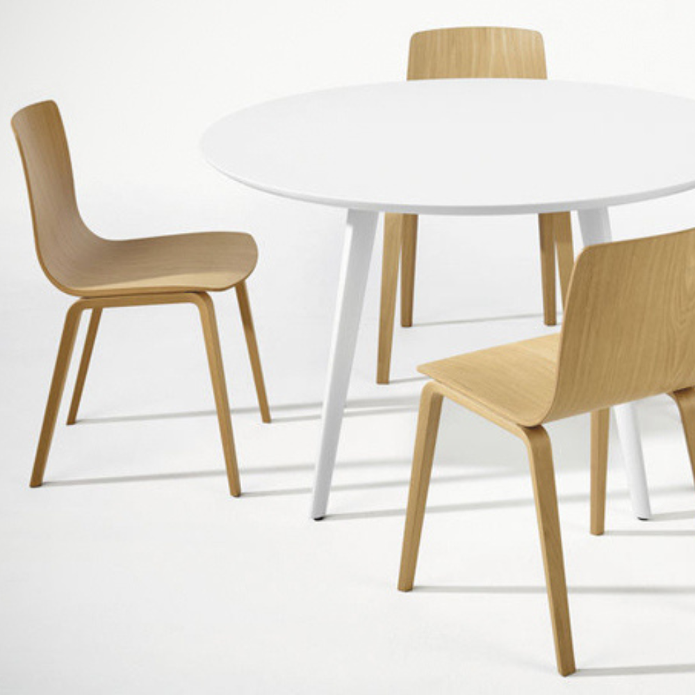 Asiento sobre estructura de 4 patas y carcasa hechos de madera contrachapada con acabado laminado roble natural.