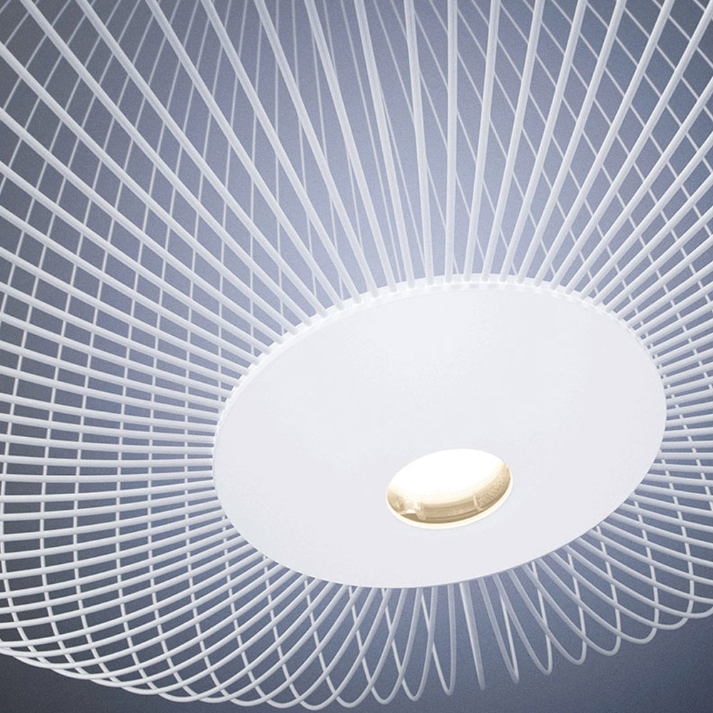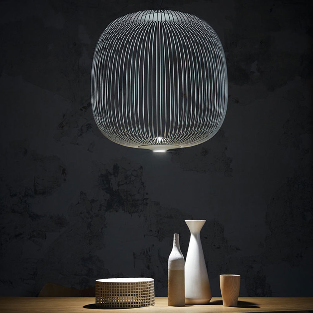 Diseñador: Garcia-CuminiSpokes 2 es una lámpara de suspensión que combina ligereza visual y sofisticación técnica. Su estructura de varillas metálicas crea un volumen envolvente que filtra la luz, generando un juego de sombras envolvente y dinámico sobre muros y techos.