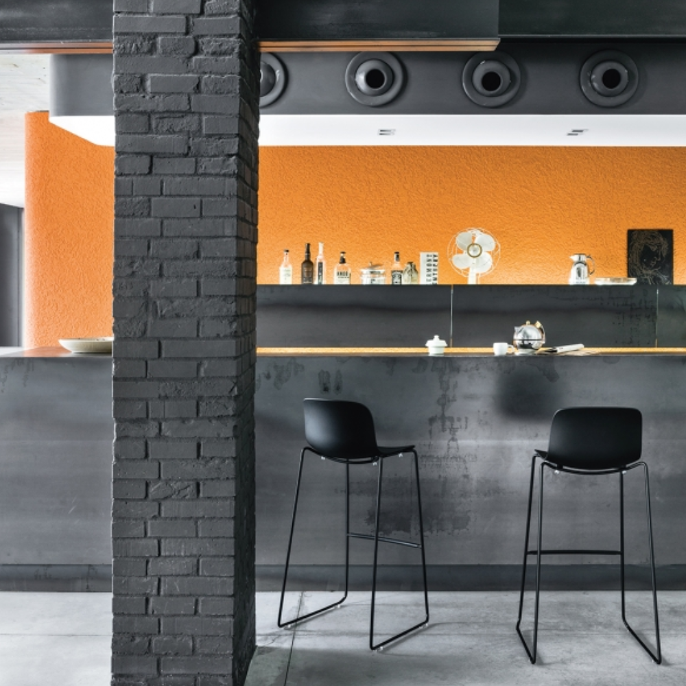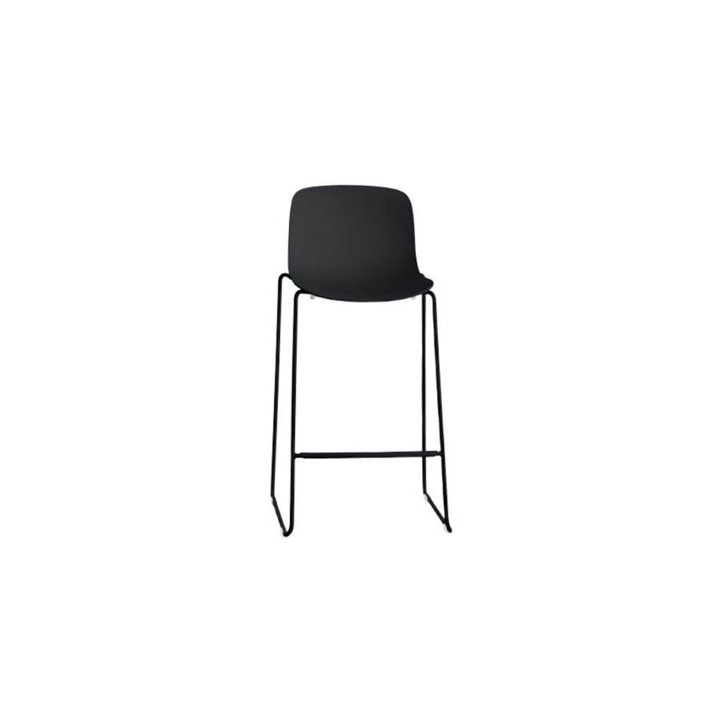 Taburete apilable, estructura en acero barnizado poliester, asiento en polipropileno color negro.