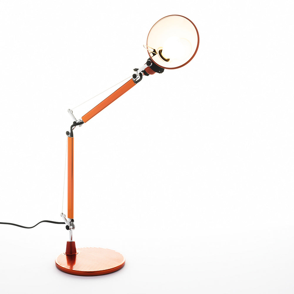Lámpara de escritorio, con brazo y cabeza orientables, color naranjo.
